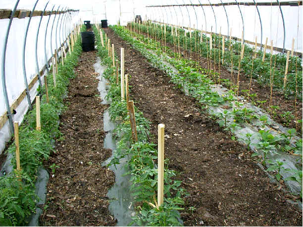 Tomatoes: We were able to harvest about 20 lbs of tomatoes per plant using a determinate beefsteak variety.  The tomato plants in the tunnel gave us a very clean, large, crack free tomato.  Flavor was excellent and the tomatoes seemed to have a higher sugar content.  Because the plants were kept dry, we noticed no disease problems. Watering was done through drip tape laid under the plastic mulch.