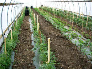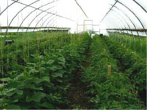 Cucumbers: Cucumbers are a great crop in the tunnels and the flavor is great.  Use varieties that do not require pollination.  Be sure to supply some sort of support for the vines to climb on.  Water must be supplied consistently to maintain quality cucumbers.